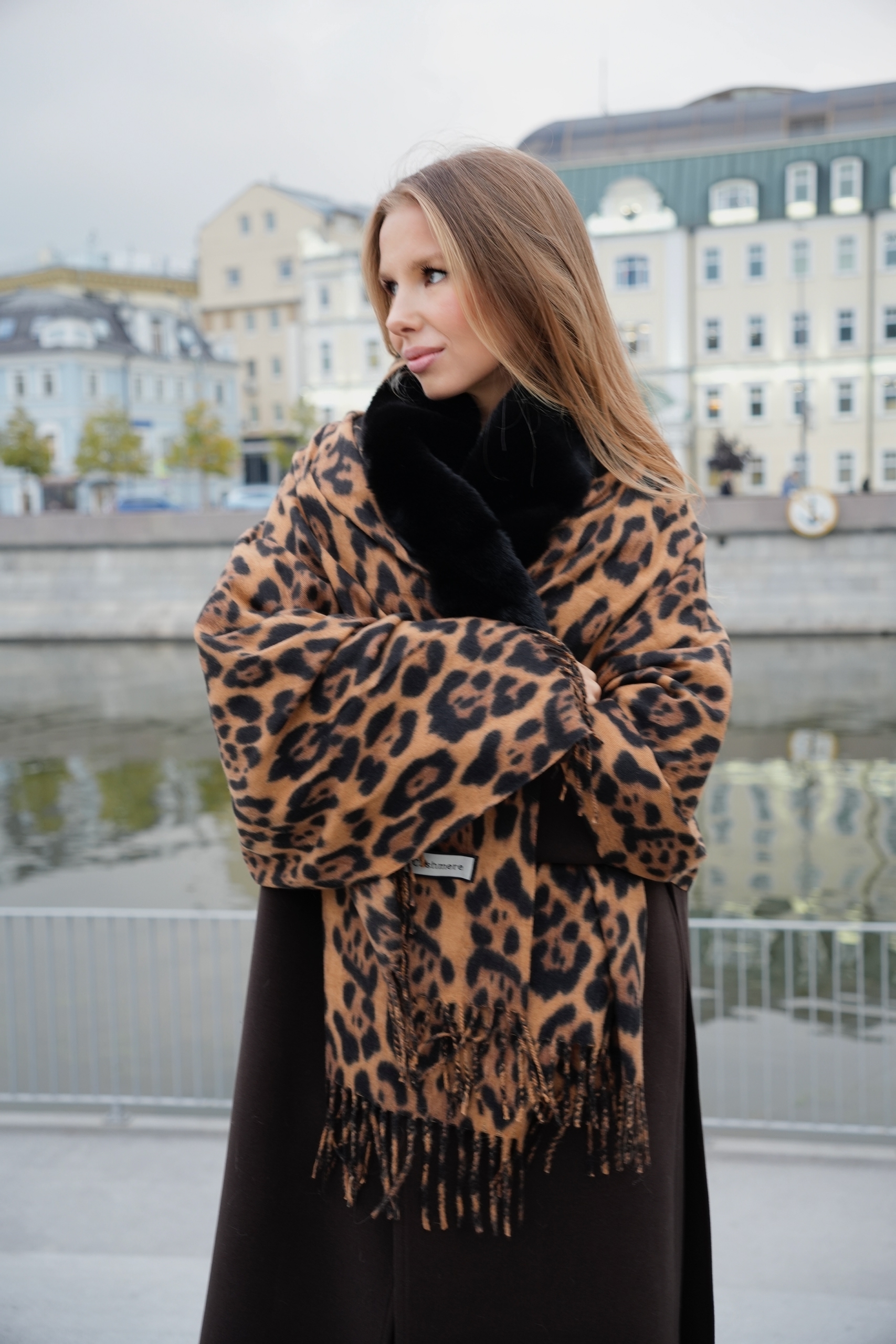 Палантин с мехом коричневый лео
